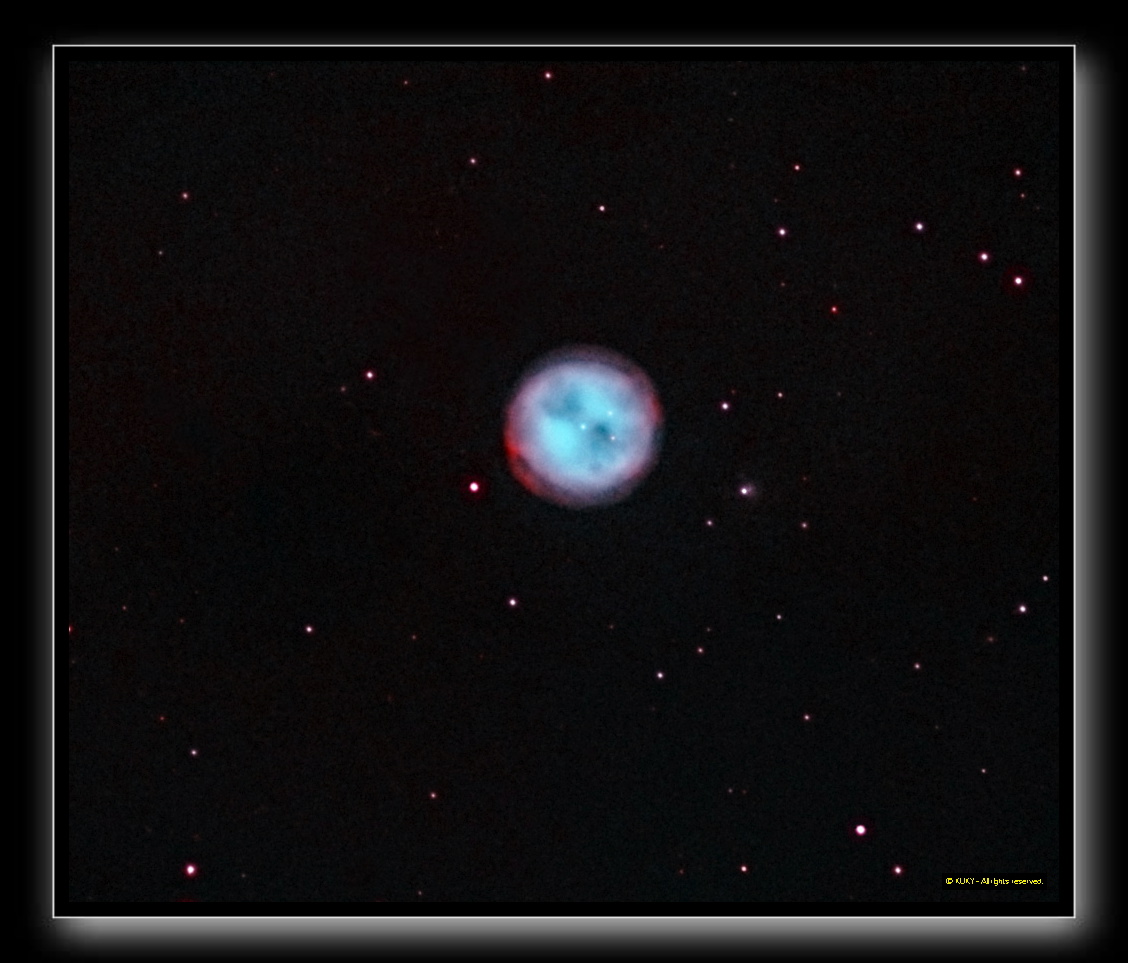Ha OIII OIII FCT150 M97 is one of the fainter objects in Messier's catalog, discovered by Pierre Méchain on February 16, 1781. M97 is one of the more complex planetary nebulae. Its appearance has been interpreted as that of a cylindrical torus shell (or globe without poles), viewed oblique, so that the projected matter-poor ends of the cylinder correspond to the owl's eyes. This shell is enveloped by a fainter nebula of lower ionization. The mass of the nebula has been estimated to amount 0.15 solar masses, while the 16 mag central star is believed to be of about 0.7 solar masses. Its dynamical age is about 6,000 years. (from Stephen J. Hynes, Planetary Nebulae).